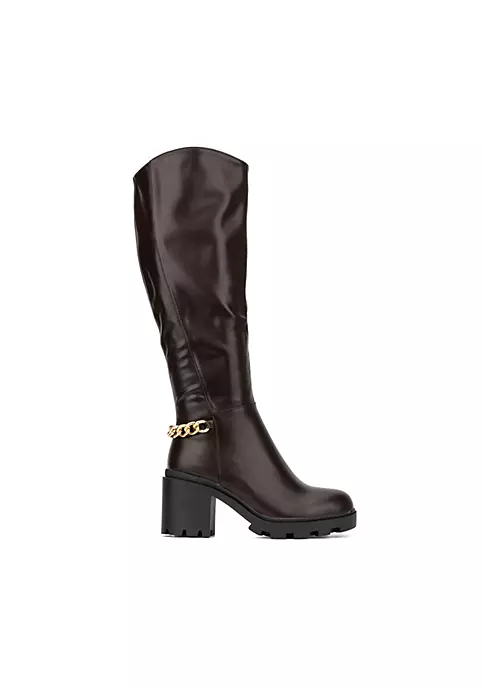 The Athena boot features a platform sole and chunky heel. It’s carefully embellished by a metallic chain, a round toe and a side zipper fastening.