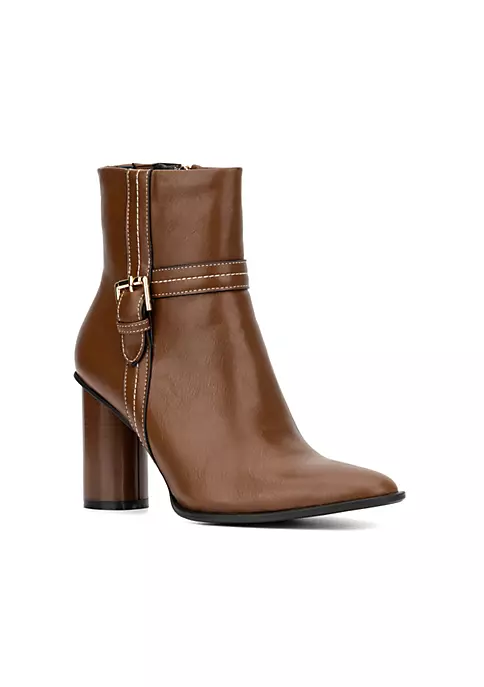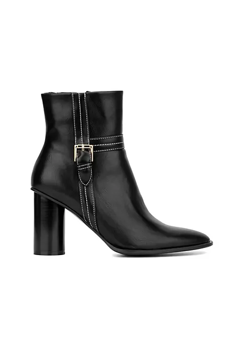 The London boot features a chunky heel, side zipper, pointed toe and a buckle décor. Perfectly paired with jeans, dress or skirt for a chic look.