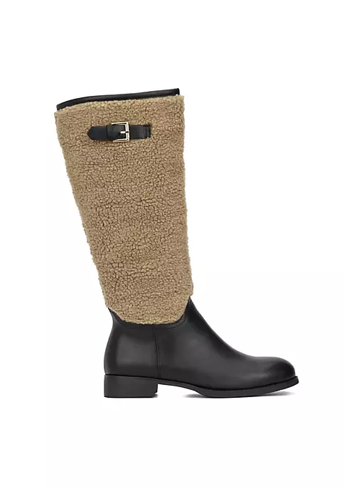 The cozy Misty boot is a stunning knee-high faux fur design with a buckle décor and short comfy heel that will surely keep you warm all season.