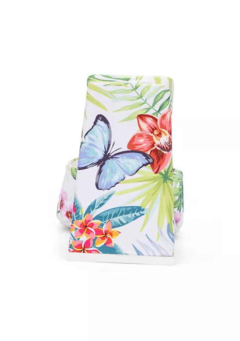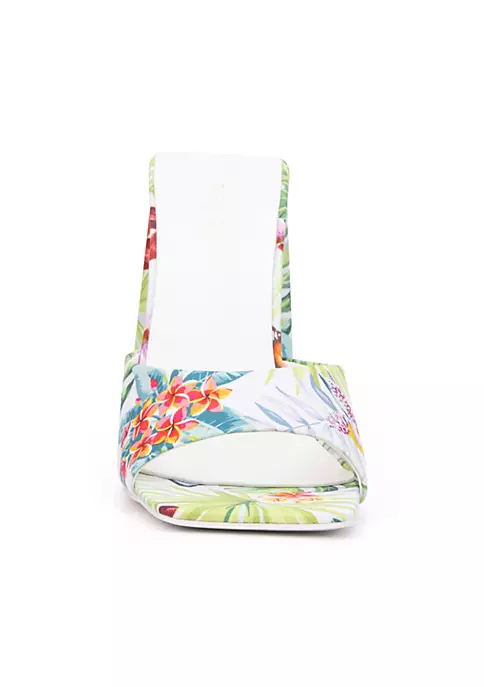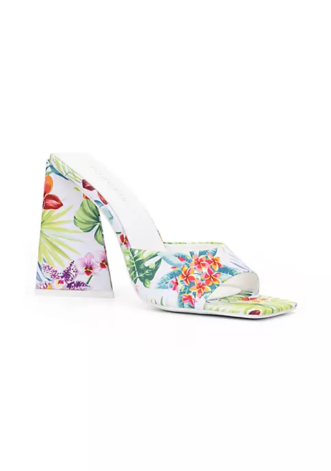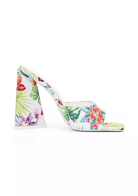 Paradise sandals for an exotic girl like you. Open toe block high heels with tropical pattern. Where wild meets elegance. Upper: 100% Faux Leather, Outsole Complete: 80% Rubber 20% Textile, Lining: 70% Faux Leather, Heel Height: 5
