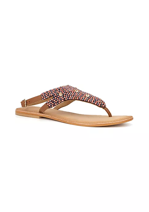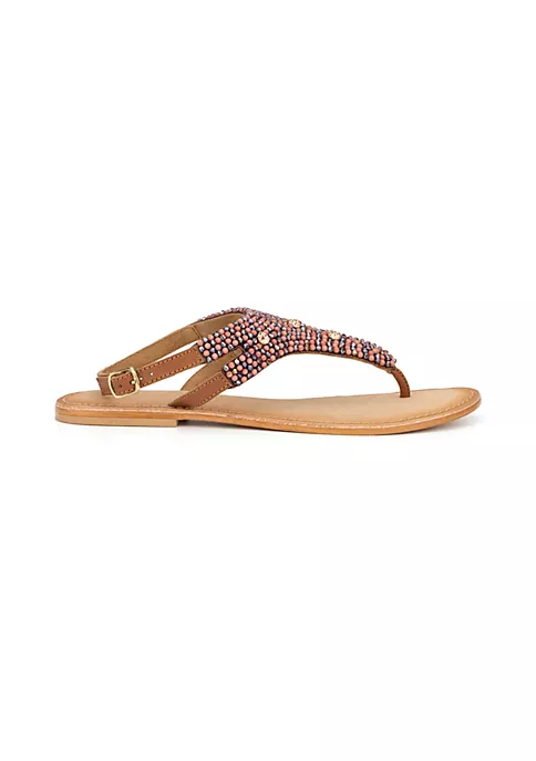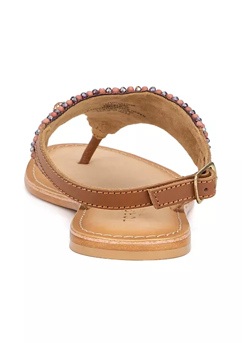 Beaded strappy sandal for an edgy and relaxed look. The Vega Sandal by Torgeis is easy to wear and light on the feet. A slide design and flat footbed brings extra comfort on casual days. Upper: 75% Beads and Trims, 25% Leather, Outsole Complete: 100% Leather, Lining: 100% Leather, Heel Height: .20″